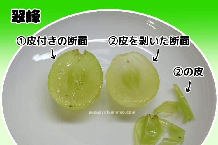 皮ごと食べられますが、皮は薄い割にはちょっと丈夫なので、食べていると口の中に皮だけ残りやすいです。ただ黒系のものなどのように分厚くなく渋みも強くないため、多少口に残ってもあまり気にはならないでしょう。皮はちょっと剥きづらいですがきれいに剥けるので、剥くか剥かないかは好みでいいんじゃないかと思います。