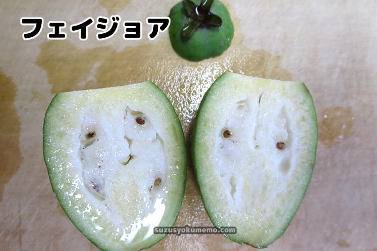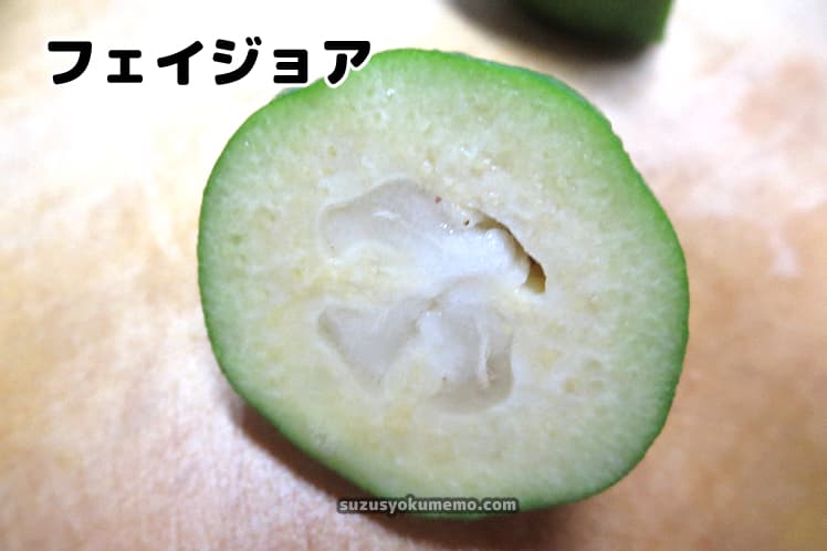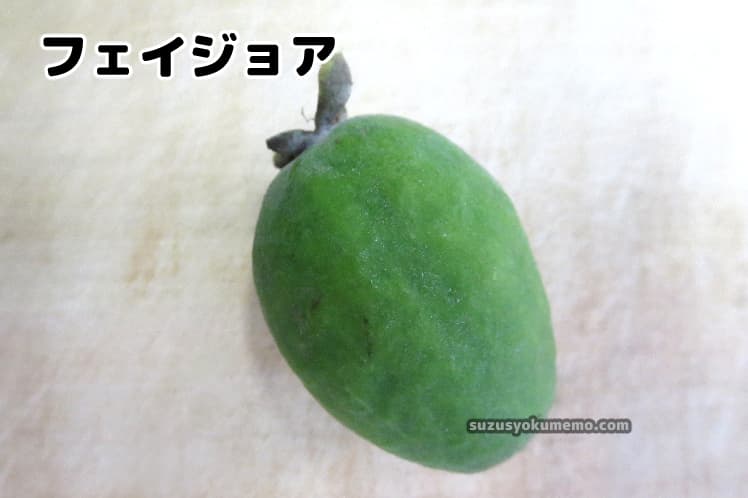 『フェイジョア』と呼ばれる果物。大きさはおそらく個体差があるとは思いますが、当時購入したものは鶏卵ほどかそれよりちょっと小さいくらいでした。
