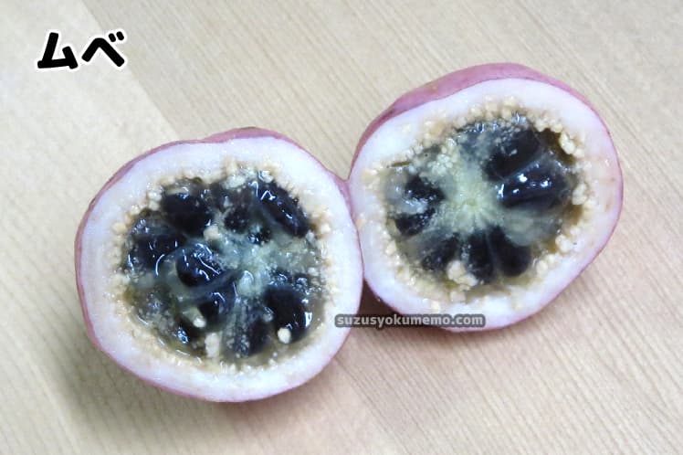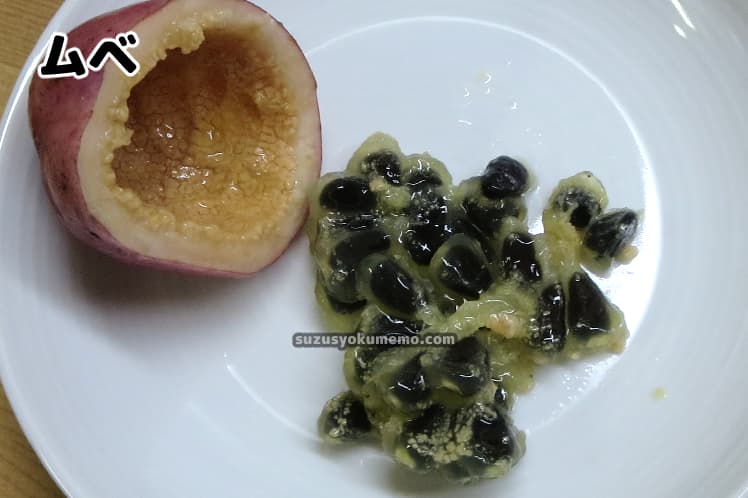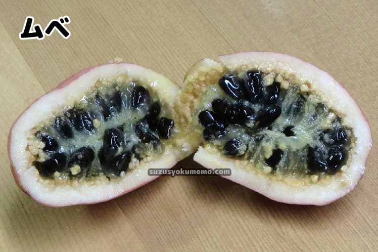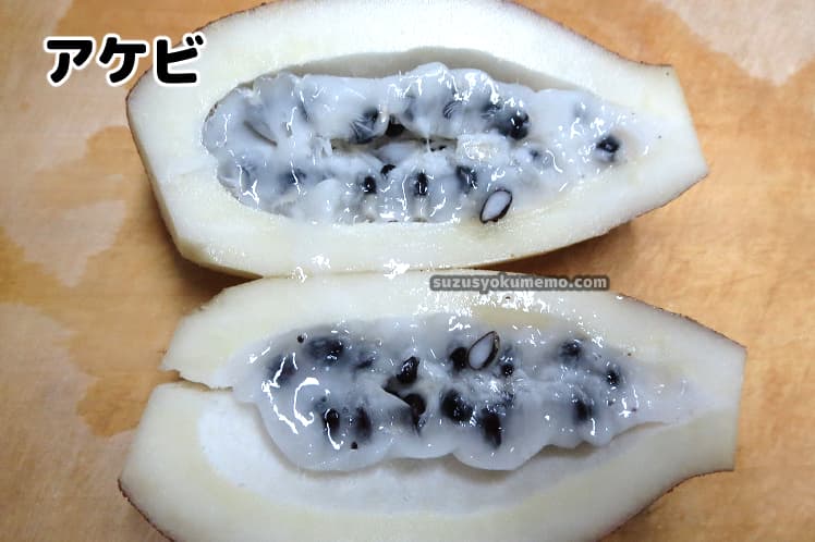 厚みのある皮の中に黒い種とゼリー状の果肉があるのはムベと同様。ただしアケビの場合ゼリー部分が白いという違いがあります。また皮も分厚いようです。