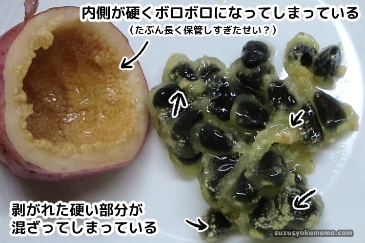 おそらく長い間保管していた弊害なのではと思うんですが、皮の内側が硬くボロボロになってしまっていて、中身をすくったときにもくっついてきてしまいます(先ほどの断面の皮と中身の間に見えたツブツブ部分はこの硬くなった部分が剥がれたもの)。これが混ざると大変食べづらい。何とか除けないかと試してみたんですが洗うとゼリー部分ごと流れてしまうので除くのはちょっと厳しいかなぁという結論に。