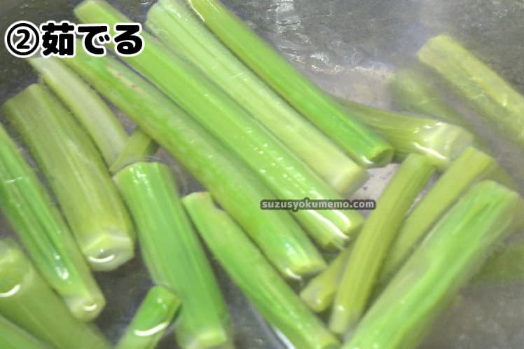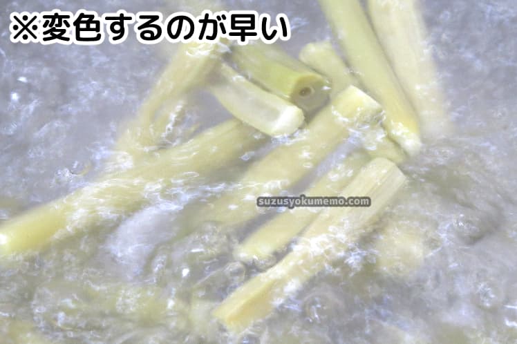 沸騰した湯に先ほど切ったイタドリを入れ、軽く茹でます。