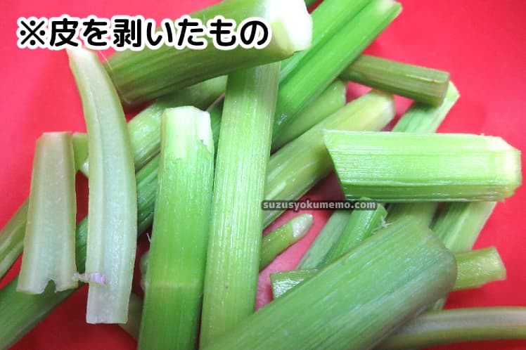 剥き終わったら葉や根元の断面(※)を切って処分し、残りを適度な大きさに切り分けておきます。