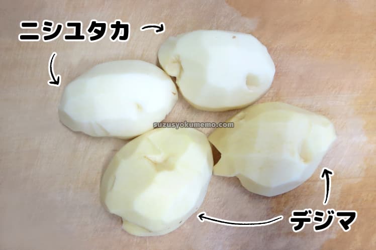 また、マッシュして男爵いもと比較してみたところ(見た目ではちょっとわかりづらかったため写真は撮りませんでした、すみません…)、男爵はほっくりした感じになりますが、デジマはしっとりというかねっとり。とは言え、ポテトサラダにするのであればマヨネーズや具材が入るのでそこまで問題ないのではないでしょうか。