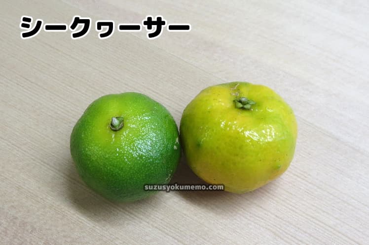緑と黄色のシークヮーサー。緑の方が酸味が強いようなイメージがありますが、少なくとも冬場に売ってる分に関してはそこまで変わらないように思います(あくまで個人的所感)。