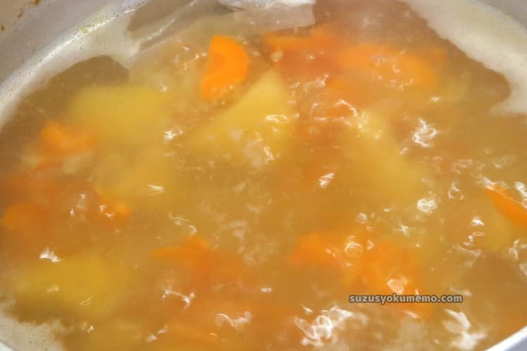 水から茹でて15分でこの状態。既に角が溶けています。ちなみに5分前に硬さを確かめたときにはまだ溶けておらず竹串も通りづらい状態だったと記憶しているのでここまであっという間です。