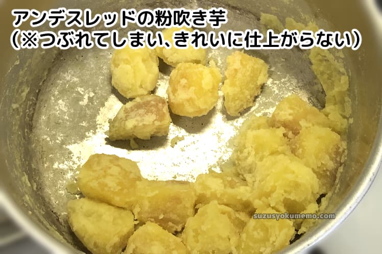 茹でて火が通ってから鍋を揺することで粉がきれいに吹くのですが、表面が溶けすぎてドロドロになってしまいました。煮すぎたのが原因である可能性は捨てきれないため、タイミングをはかればもしかしたら可能なのかもしれないですが、かなり慎重にやらないと難しそう。