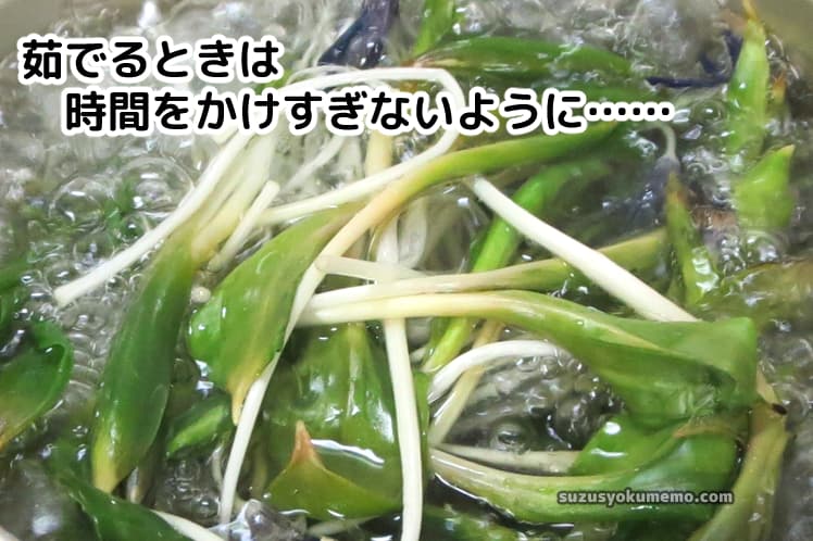 カタクリはサッと茹でるのがポイント。長時間煮ると食感や色が悪くなる可能性があります。また、茹で時間が短ければ火を通してもシャキッとした食感を残すことができます。