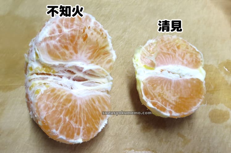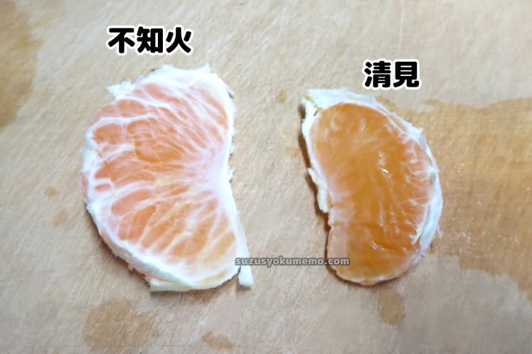 味は、不知火は甘みがかなり強く、酸味はそこまで強くありません。清見は甘みもしっかりありますが、オレンジの風味・酸味が少し強め(とはいってもオレンジよりは酸味がひかえめな印象)。明らかに味が違います。シンプルに甘いものが好みの人は前者、オレンジのようにさわやかな酸味もほしいという人は後者が合うかなと思います。