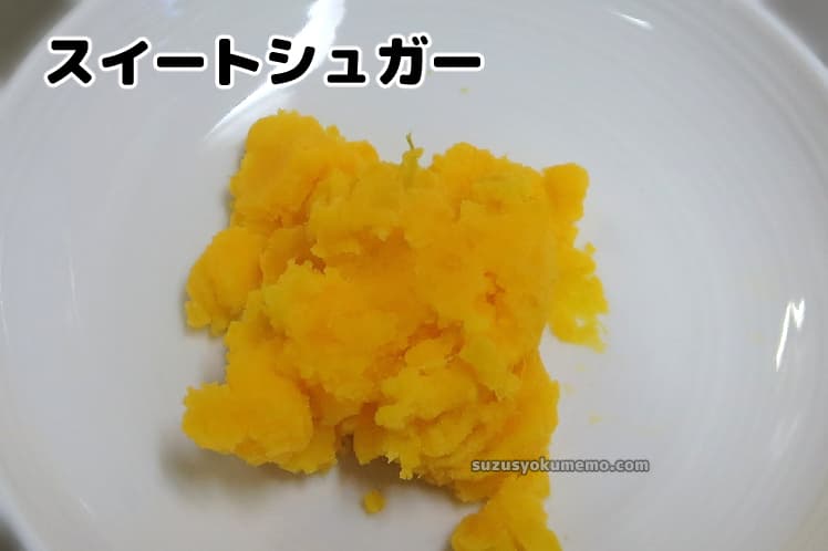 味の濃厚さに関しては、通常のかぼちゃに軍配が上がるかなと思います。スイートシュガーはそれと比べるとあっさりめの味。ですが、それ以上に私が気になったのは食感でした。通常のかぼちゃ(西洋かぼちゃ)は日本かぼちゃと比べると身がしっかりしているのですが、それでもある程度はねっとり感があります。スイートシュガーは内側は少しやわらかめですが、外側はかなりほっくりして歯切れが良いように感じます。